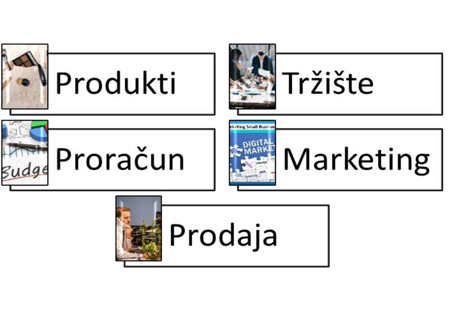 5 stupova planiranja: produkti, tržište, financijska struktura, prodaja, promocjija i marketing.
